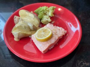 Filet de saumon, pommes de terre sauce champignon