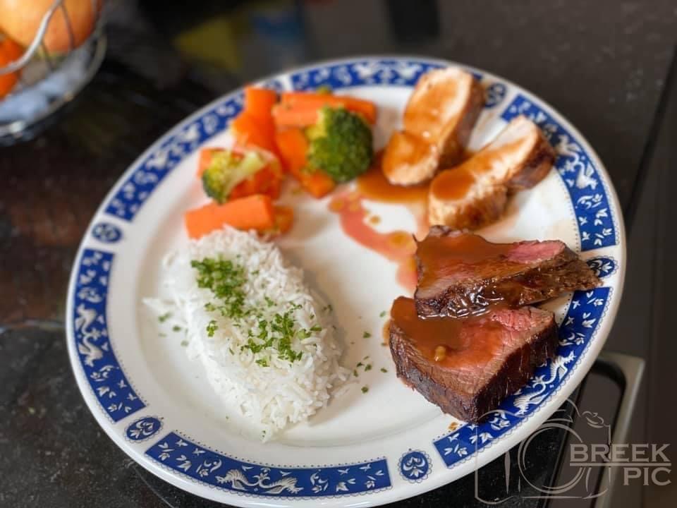 Duo de viandes (boeuf, poulet), riz et jardinière de légumes