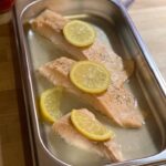 Filet de saumon, sauce oignons, pommes de terre et jardinière de légumes