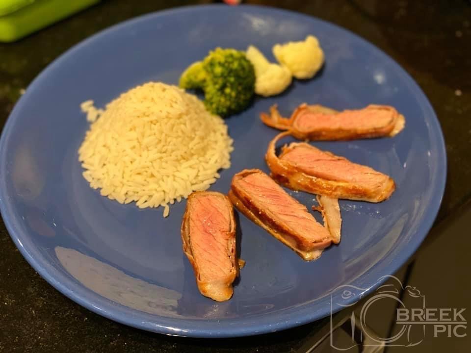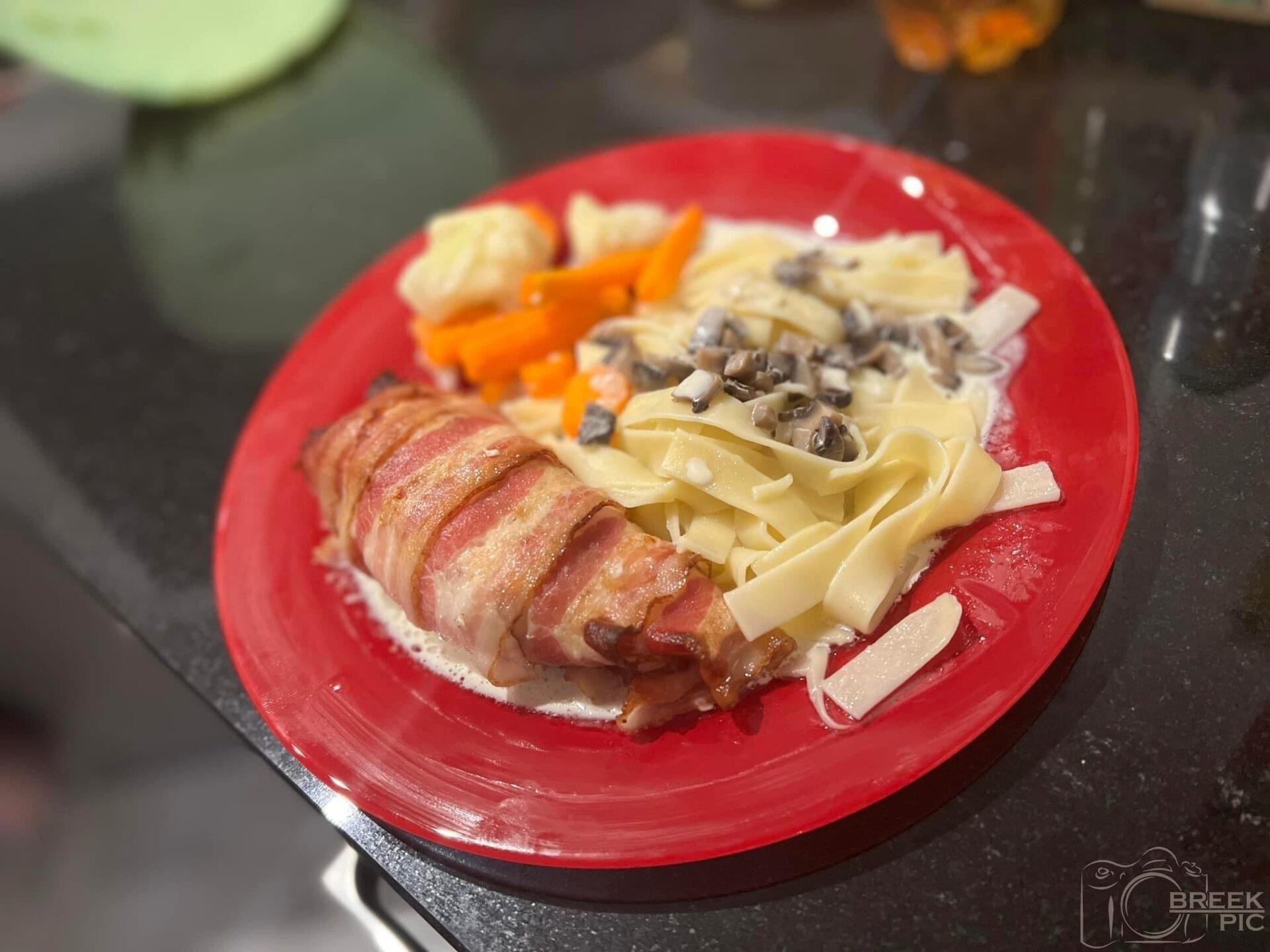 Poitrine de dinde bardée de lard, nouilles et sauce champignons