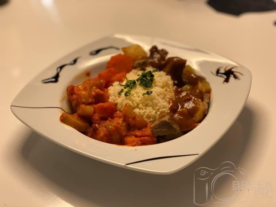 Tranche de boeuf, sauce chasseur, légumes et gratin de pommes de terre maison